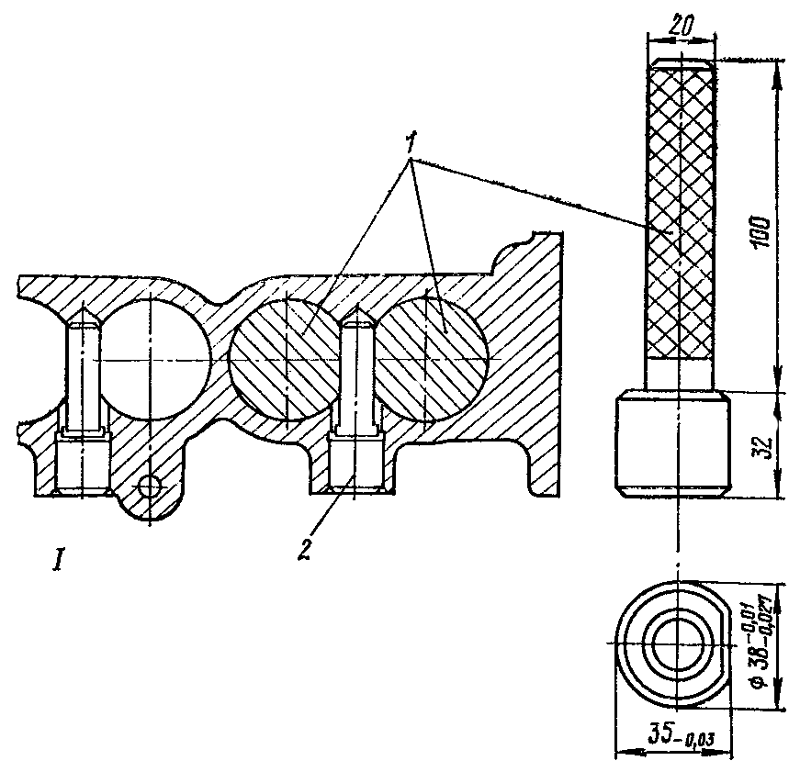 Смажьте маслом направляющие пальцы 2 и запрессуйте их ударами медного молотка в блок насоса заподлицо с торцами бобышек. Выньте оправки из блока насоса. Непараллельность плоскости пальцев относительно образующих отверстия под толкатель допускается не более 0,05 мм.