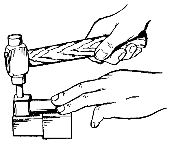 Положите тягу 4 ( см. рис. 159 ) ушком на медную подставку. Смажьте маслом втулку 5 и запрессуйте ее в ушко тяги ударами медного молотка заподлицо с торцами ушка тяги.