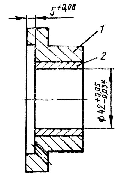Запрессуйте в блок с помощью ступенчатой оправки и молотка втулки 6 ( см. рис. 162 ) тяги рейки -заподлицо с плоскостями блока насоса. Разверните втулки совместно под размер тяги рейки; обеспечив зазор между втулками и тягой в пределах 0,030...0,074 мм. Запрессуйте в блок переднюю втулку 7 так, чтобы торец втулки выступал за плоскость блока 5 на (22±0,42) мм. Запрессуйте в корпус 1 ( см. рис. 163 ) подшипника кулачкового валика бронзовую втулку 2 заподлицо с поверхностью выточки под упорную шайбу в корпусе подшипника.