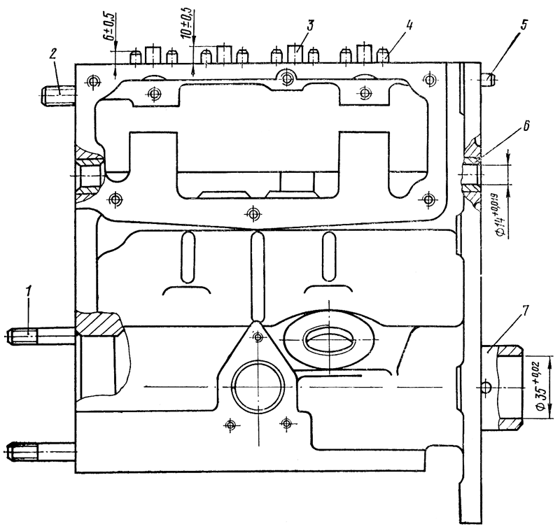 Установите блок насоса кулачковым валиком вниз. Положите на толкатели 1 ( см. рис. 161 ) тарелки 2 и заверните в толкатели регулировочные хвостовики 4, навернув на них предварительно контргайки 3. Запрессуйте в отверстия верхней плоскости восемь установочных штифтов 4 ( см. рис. 162 ) под секции насоса так, чтобы они выступали над плоскостью на (6±0,6) мм. Запрессуйте топливоподводящие трубки 3. Торцы топливоподводящих трубок должны выступать над плоскостью на (10+0,45) мм. Отверстия топливоподводящих трубок заглушите деревянными пробками.